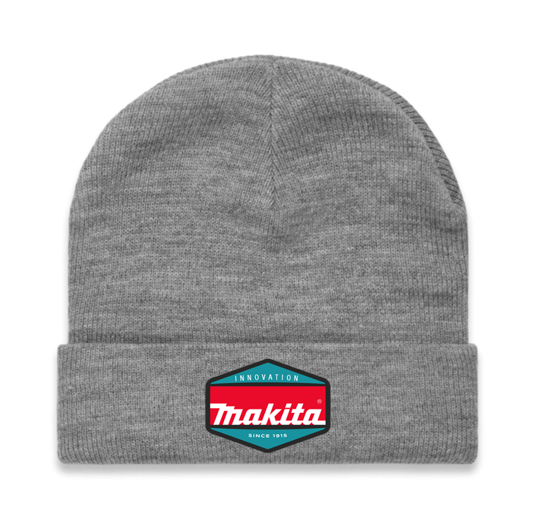 Knitted acrylic (wont itch!) grey beanie 9 gauge with custom woven patch – one size fits most.