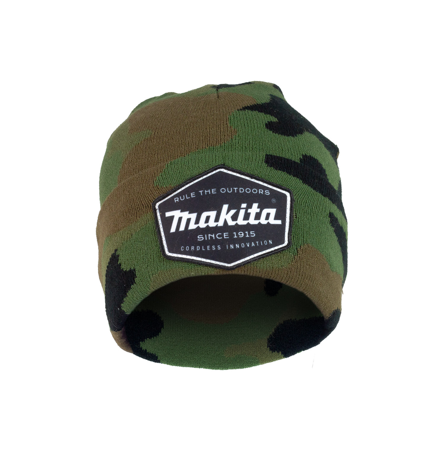 Knitted acrylic (wont itch!) camo beanie 9 gauge with custom woven patch – one size fits most.